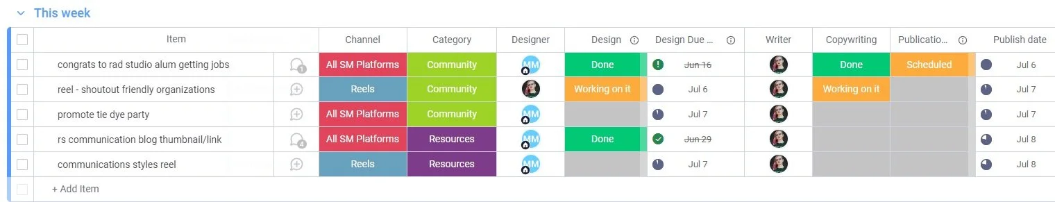 Rad Magpie uses a Monday board for our content calendar (left), but you can just as easily use a spreadsheet (right). Your posting schedule is up to you, just try to stay consistent.